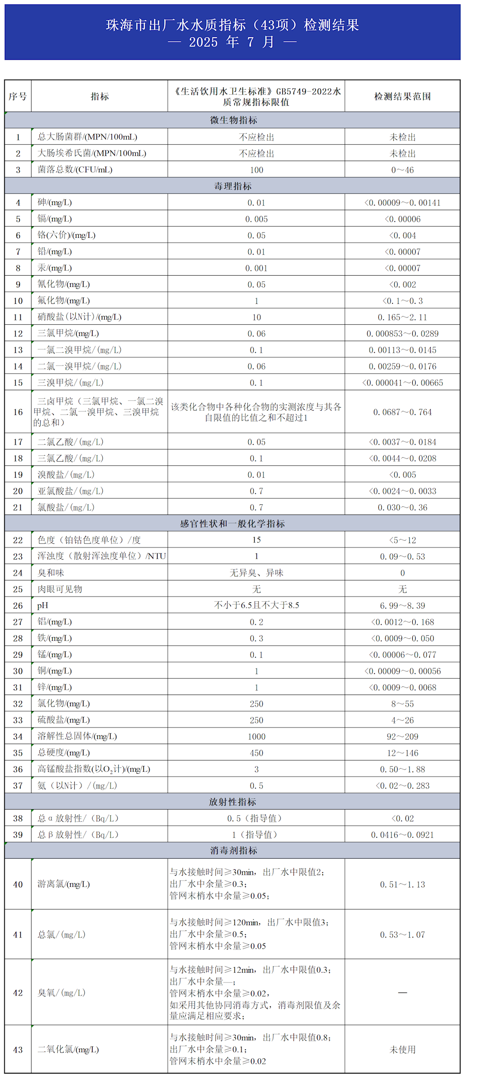 2025年7月珠海市出廠水水質指標(43項)檢測結果 發(fā)布時間:2025年08月14日 瀏覽次數(shù): 次 小大 原文下載:2025年7月珠海市出廠水水質指標(43項)檢測結果.xls 【打印正文】