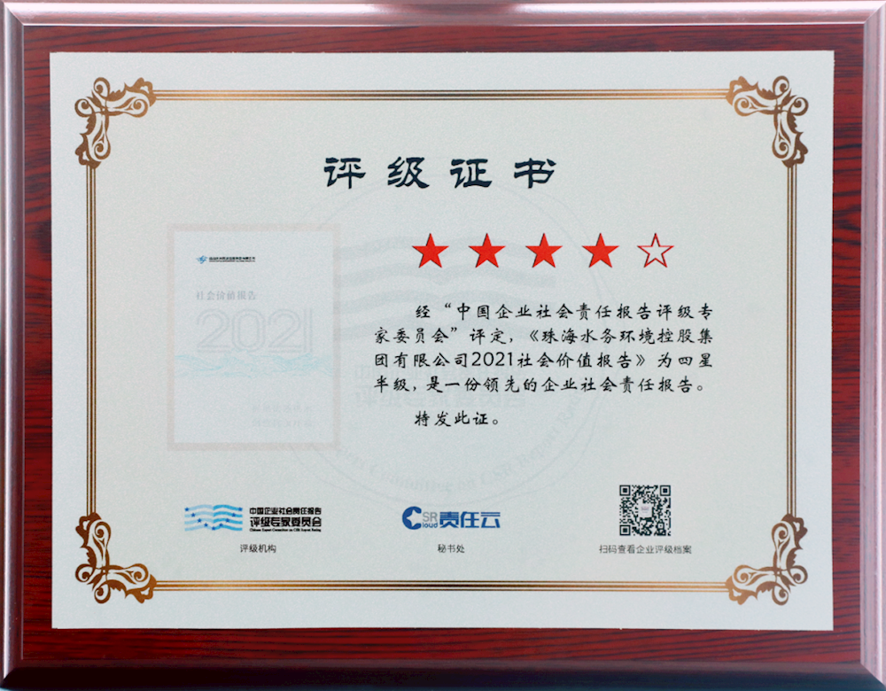 經(jīng)過十年錘煉,珠海水控集團作為粵港澳大灣區(qū)水務(wù)環(huán)保行業(yè)的大型國有企業(yè),在擔(dān)當(dāng)國企社會責(zé)任,踐行國企社會價值領(lǐng)域堅持不懈地努力,獲得了更多的社會認(rèn)可?!爸袊髽I(yè)社會責(zé)任報告評級專家委員會”根據(jù)中國社科院《中國企業(yè)社會責(zé)任報告指南(CASS-CSR4.0)》《中國企業(yè)社會責(zé)任報告評級標(biāo)準(zhǔn)2020》權(quán)威依據(jù),經(jīng)過嚴(yán)格的評審過程,對《珠海水控集團2021年度社會價值報告》做出四星半級的評級結(jié)果,認(rèn)為“是一份領(lǐng)先的企業(yè)社會責(zé)任報告”。