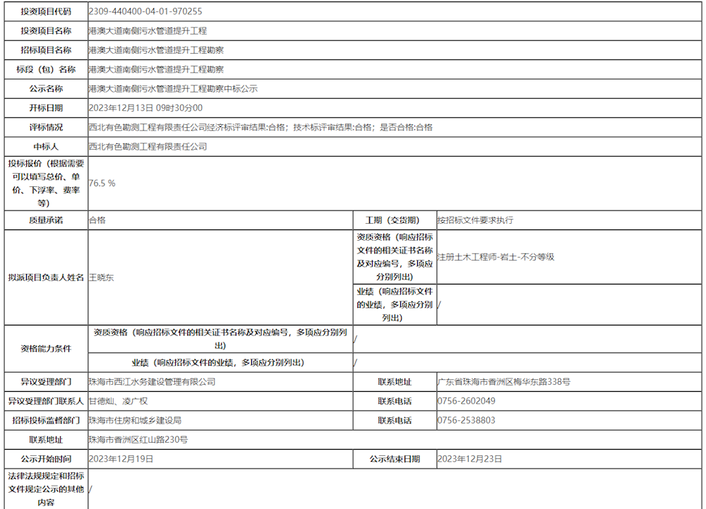港澳大道南側污水管道提升工程勘察中標候選人公示