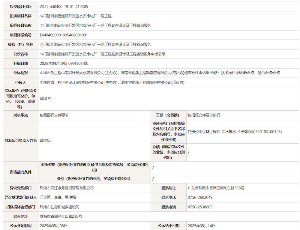 斗門智能制造經(jīng)濟開發(fā)區(qū)水質(zhì)凈化廠一期工程勘察設(shè)計及工程咨詢服務中標公示 發(fā)布時間:2025年05月08日 瀏覽次數(shù): 次 小大 【打印正文】